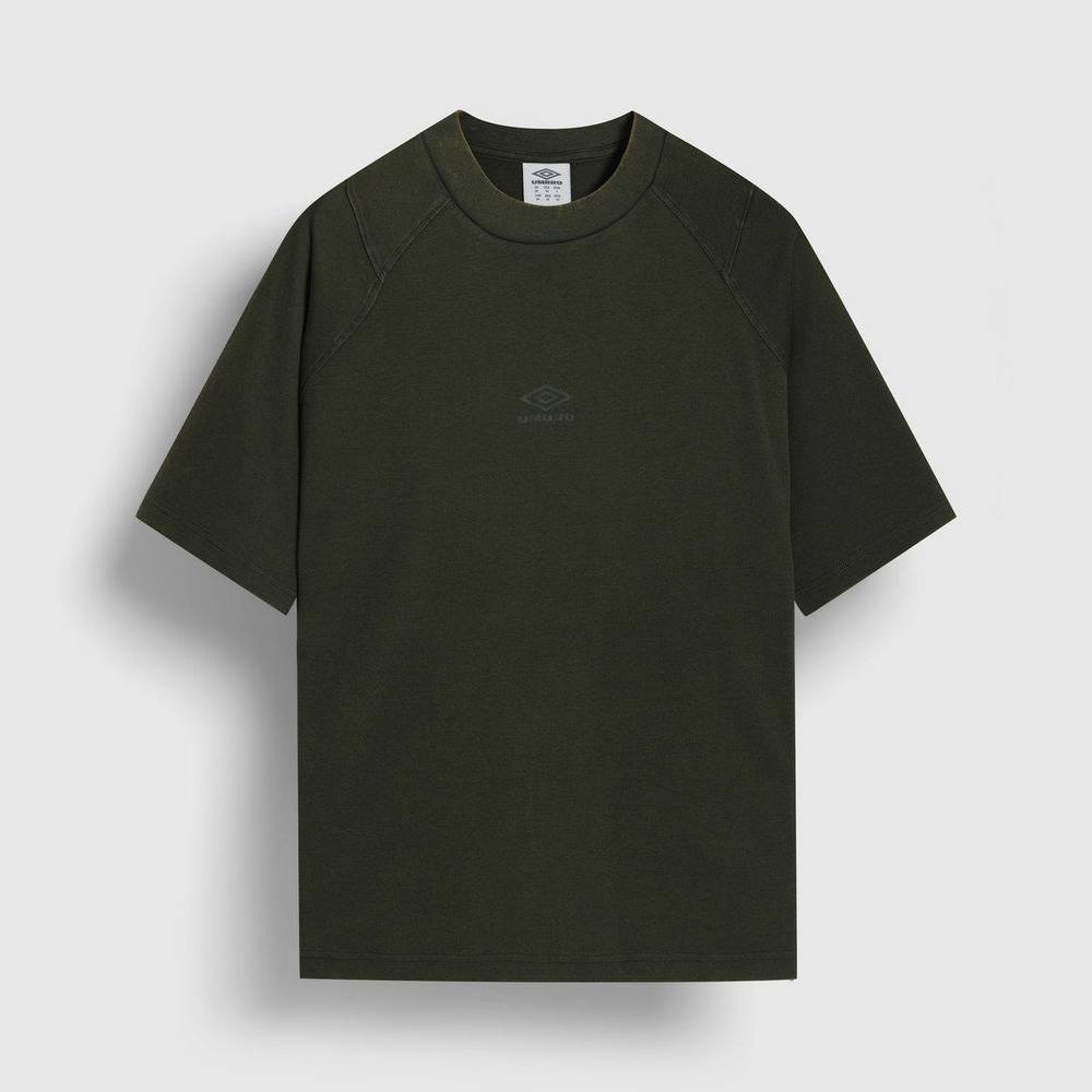 Stylish dark green washed crew neck t-shirt by Umbro. Made from a blend of cotton and elastane, it offers a soft touch and garment-washed finish. Features a printed logo and ribbed crew neckline. Ideal for a relaxed, boxy fit and casual wear.