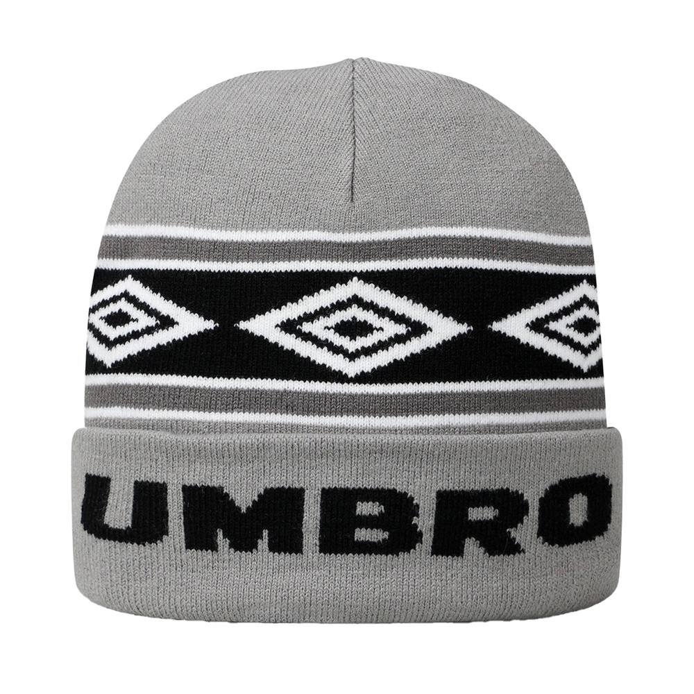 Stylish Umbro beanie in dark grey with a contrasting diamond pattern. Made from 100% acrylic, this beanie features a ribbed cuff for a snug fit. Ideal for cool weather.