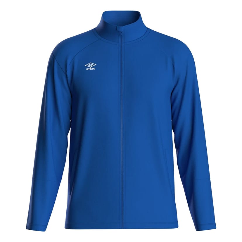Stylish Umbro men's track jacket in mid blue. Made from 100% polyester, this jacket features a ribbed standing collar, full zip fastening, and contrast logo. Ideal for active wear and casual outings.