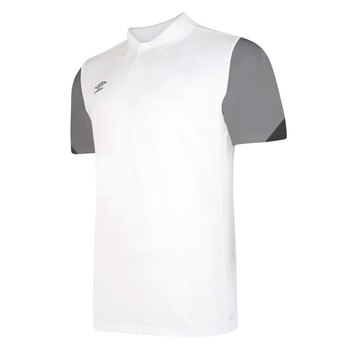 This Umbro Men's Total Training Polo Shirt in off-white is crafted from 100% polyester micro eyelet fabric. It features a stacked logo on the left chest, a self fabric collar, and a two-button placket. The contrast sleeves add a stylish touch to this versatile piece.