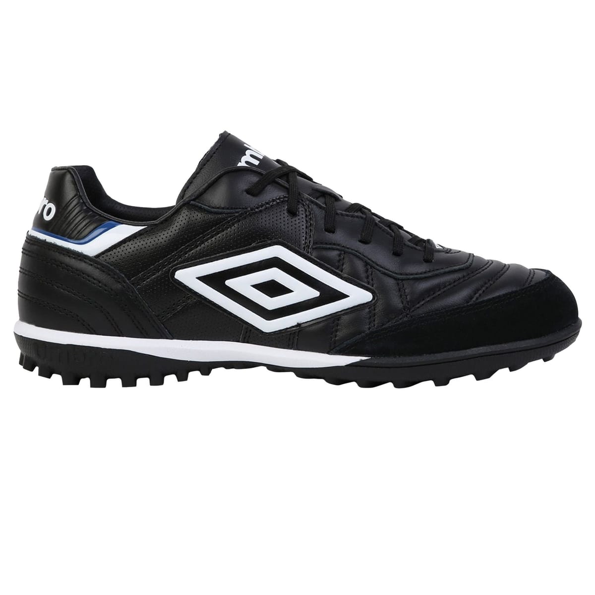 Stylish Umbro trainers in True Black leather. Featuring a full-grain leather upper, memory foam insole, and perforated PU outsole. Ideal for soccer and outdoor sports.