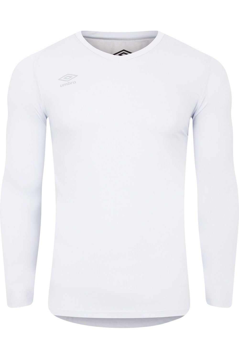 Sleek Umbro Elite V Neck Base Layer Top in white. Made from stretchy polyester and elastane, this long-sleeved top features a V-neckline and mesh back panel for breathability. Ideal for active wear and layering.