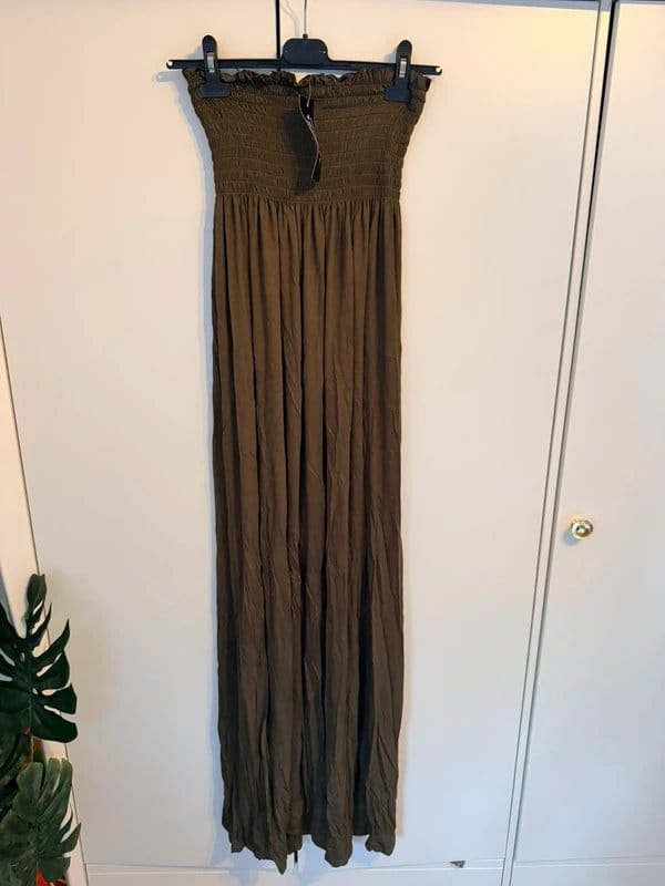 The Khaki Strapless Maxi Dress Size 12-14 is made from polyester, spandex.