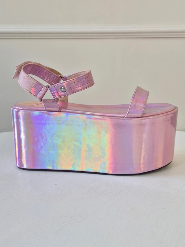 Real head-turners! These are a stunning pair of pink iridescent platform sandals that are perfect for Y2K, kitsch, trendy, or cyber-goth looks.