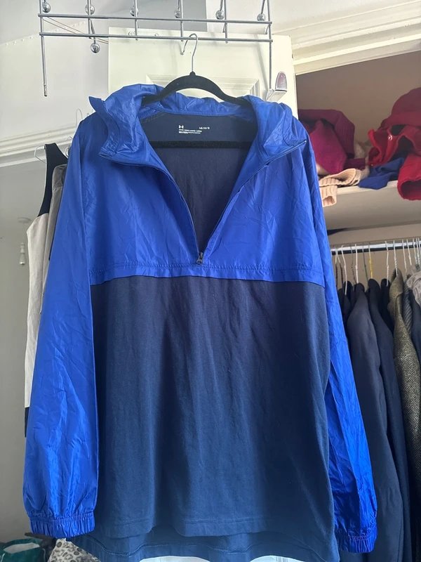 The Under Armour Blue Nylon Windbreaker Half-Zip is available in sizes L.