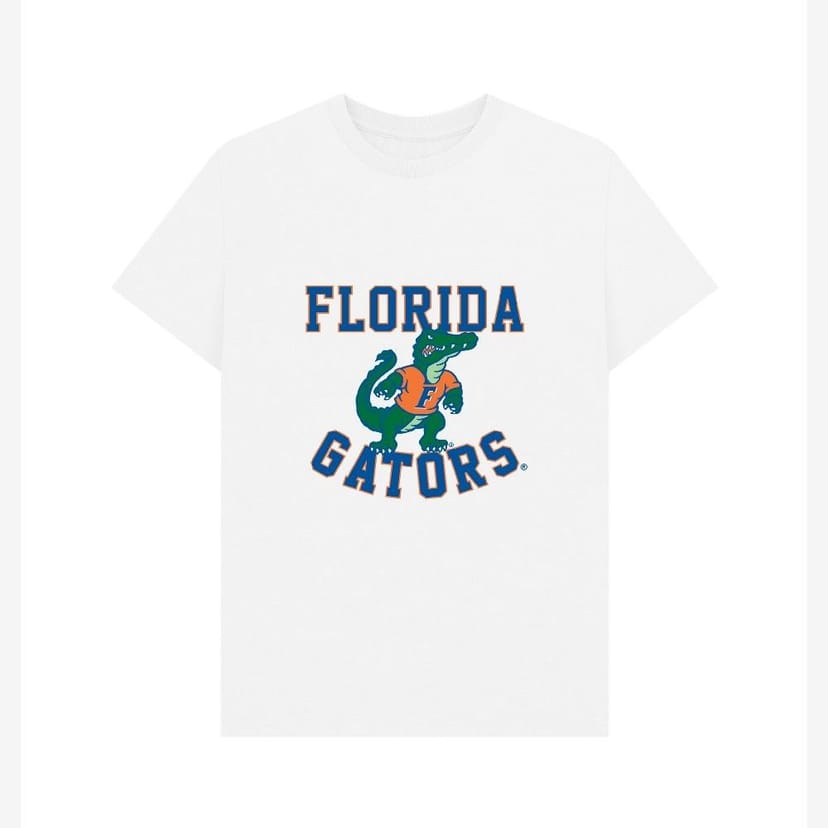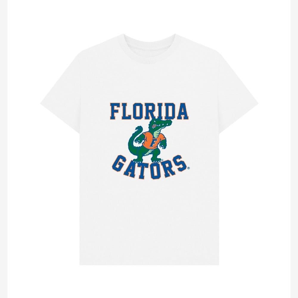 This white t-shirt features the iconic University of Florida Gators logo printed in navy blue and orange. Made from 100% combed ringspun cotton, it offers a comfortable and breathable fit. Ideal for casual wear or showing your school spirit.