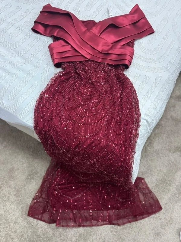 The Unlabel Burgundy Sequin Evening Gown with Off-Shoulder is ideal for evening, formal.