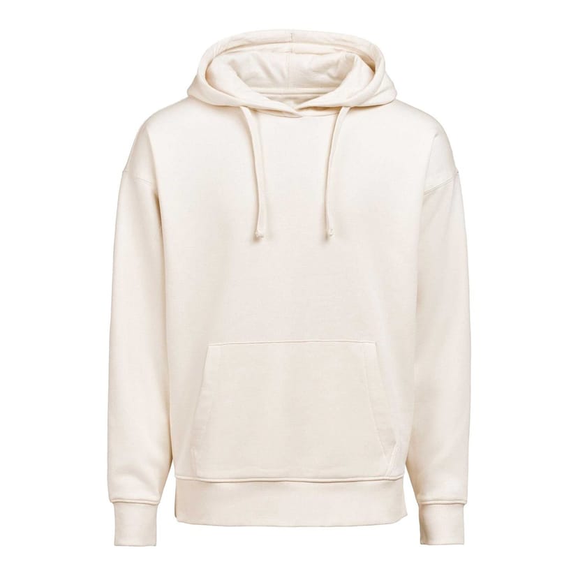 This off-white loose fit hoodie by Untagged Movement features a plain design with a drawcord hood and a kangaroo pocket. Made from a blend of 80% combed ring-spun natural cotton and 20% polyester, it offers a soft brushed texture and a ribbed hem and cuffs for added structure. Perfect for casual wear.