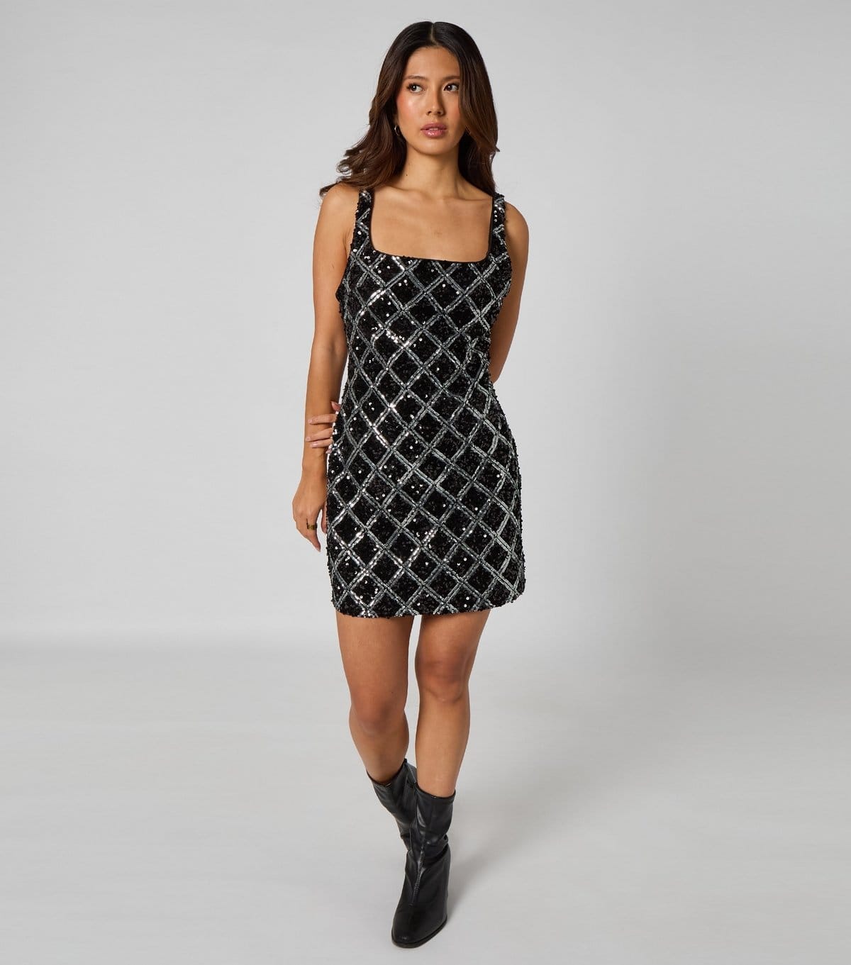 This black sequin mini dress from Urban Bliss is perfect for glam nights out and special events. Featuring a glimmering diamond pattern and a square neckline, it offers a luxe party style.