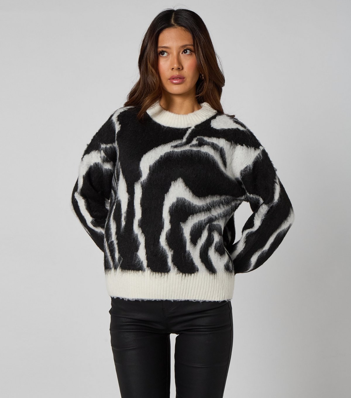 The Urban Bliss Black Zebra Pattern Jumper is made from brushed knit.