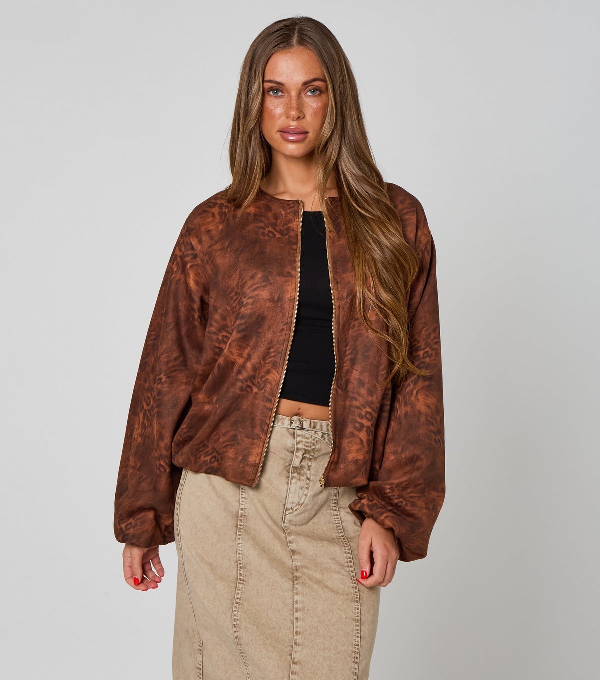 Stylish brown faux suede bomber jacket from Urban Bliss. Featuring a classic animal print, this jacket offers a relaxed fit and a puff hem for a trendy look. Ideal for layering over casual outfits.