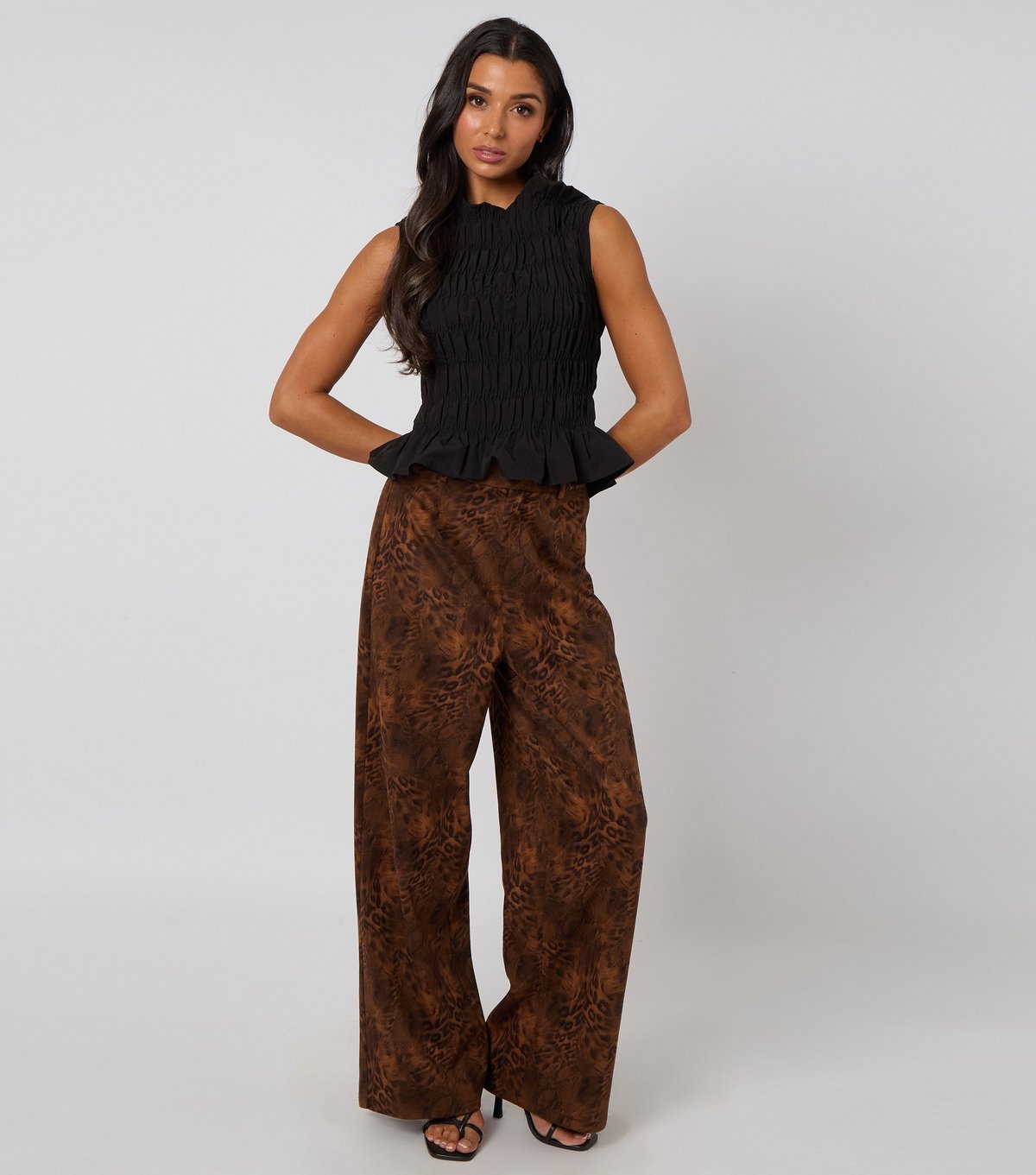 Bold brown faux suede animal print trousers by Urban Bliss. Featuring a wide-leg silhouette and a relaxed fit, these trousers are perfect for a statement look.