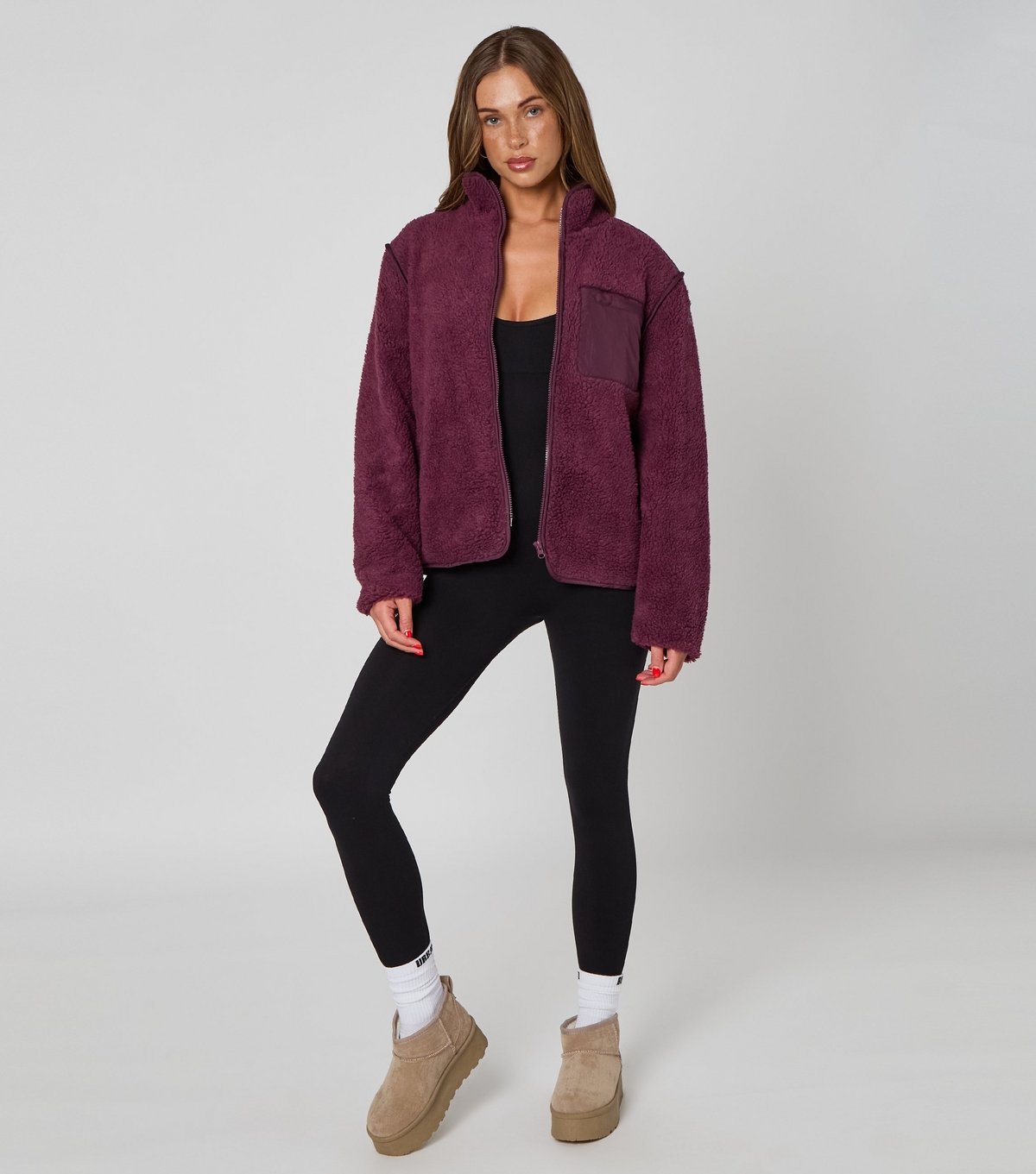 Stay snug in this dark burgundy fleece jacket from Urban Bliss this season. With its relaxed fit and handy front pocket, it's an useful layering piece during the colder months.