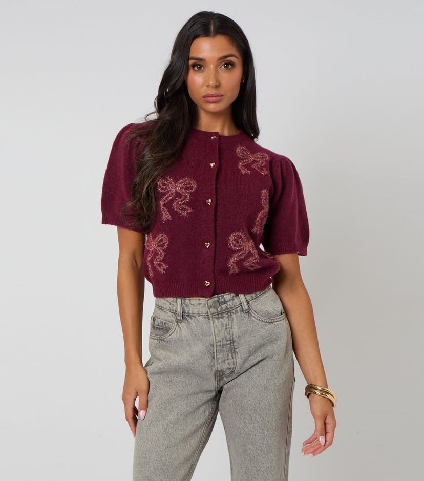 This dark burgundy knit short sleeve cardigan from Urban Bliss is perfect for layering over shirts and tees. Featuring a sparkly bow pattern and heart-shaped buttons, it adds a cute touch to any outfit. The puff sleeves and relaxed fit make it a versatile piece for casual wear.