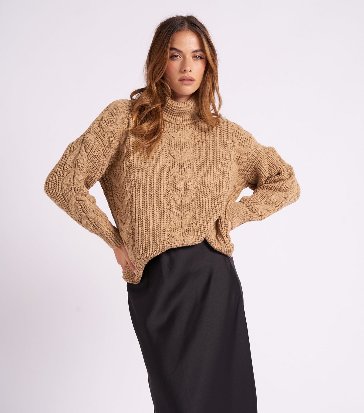 This camel cable knit jumper by Urban Bliss features a relaxed fit and a roll neck. The long sleeves and ribbed cuffs add a touch of warmth and style.