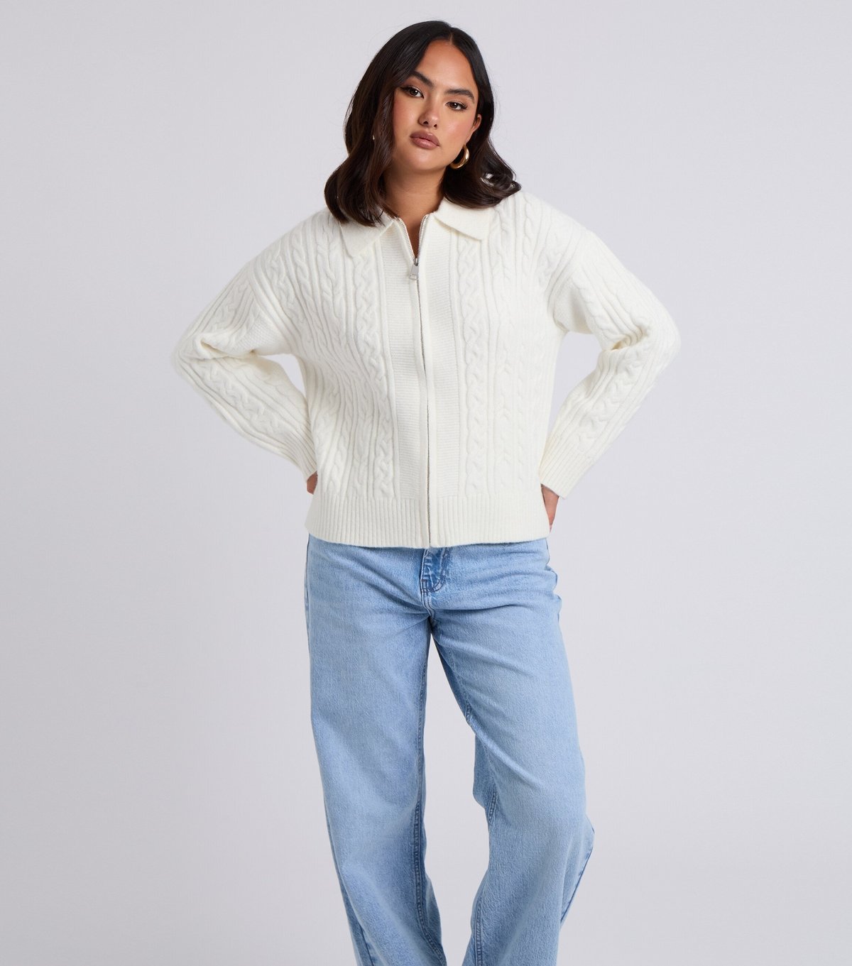 This cream cable knit cardigan by Urban Bliss features a relaxed fit and long sleeves. The collared neckline and front zip fastening add to its casual elegance. Ideal for layering over casual outfits.