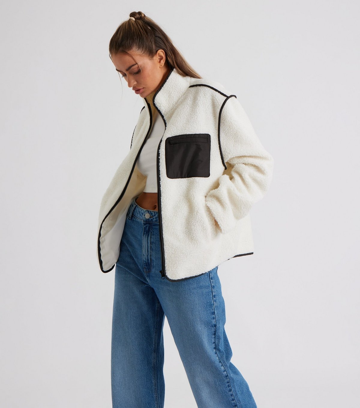 This cream fleece jacket by Urban Bliss features a relaxed fit and a high neck design. The jacket has contrast trim and side and chest pockets for added functionality. Ideal for casual wear.