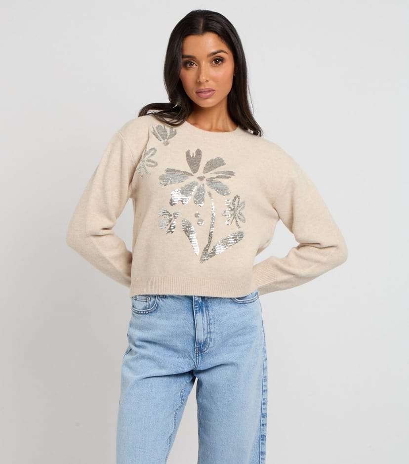 This cream floral sequin jumper from Urban Bliss will add a playful touch to your everyday wardrobe. A staple for cosy styling, it has a slightly cropped length that sits perfectly with high-waist silhouettes.