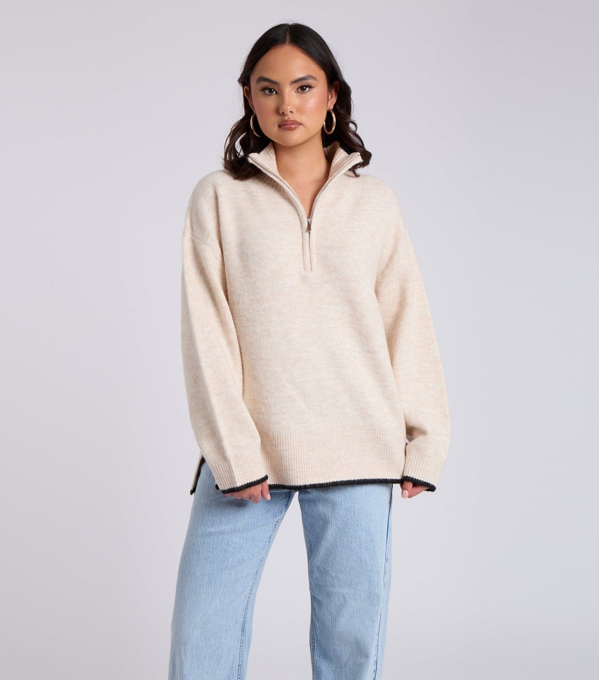 Relaxed-fit knit jumper in cream from Urban Bliss. Features a half zip, drop shoulders, and ribbed trims with black tipping. Ideal for casual wear.