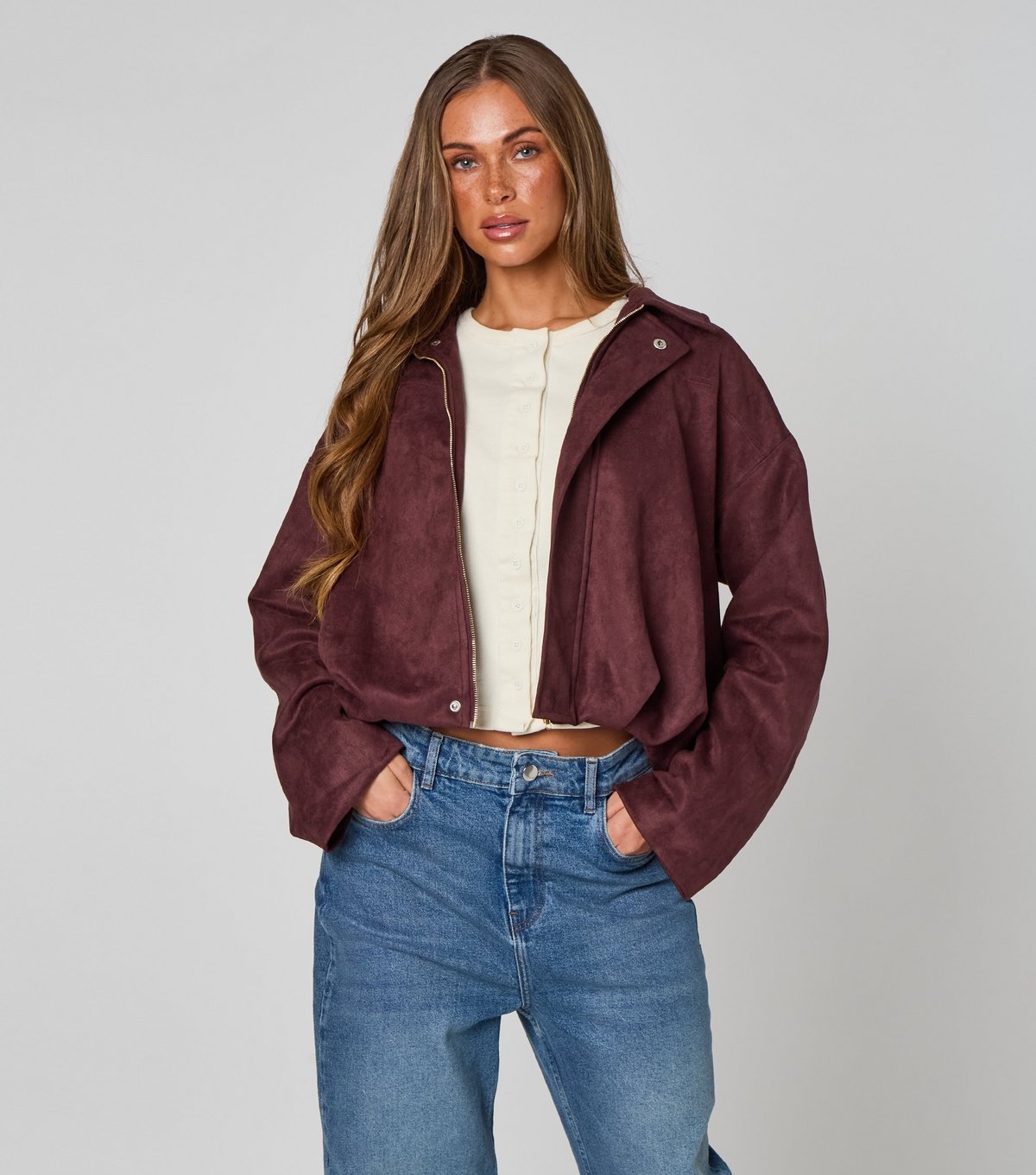 The Urban Bliss Dark Purple Faux Suede Bomber Jacket is made from faux suede.