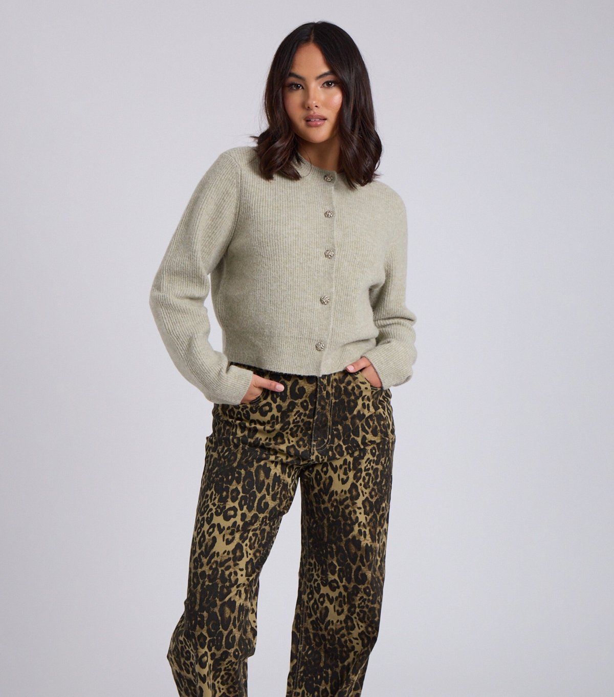 Stylish light green cropped cardigan by Urban Bliss featuring a crew neckline and long sleeves. The cardigan has a regular fit and is adorned with floral buttons. Ideal for casual wear.