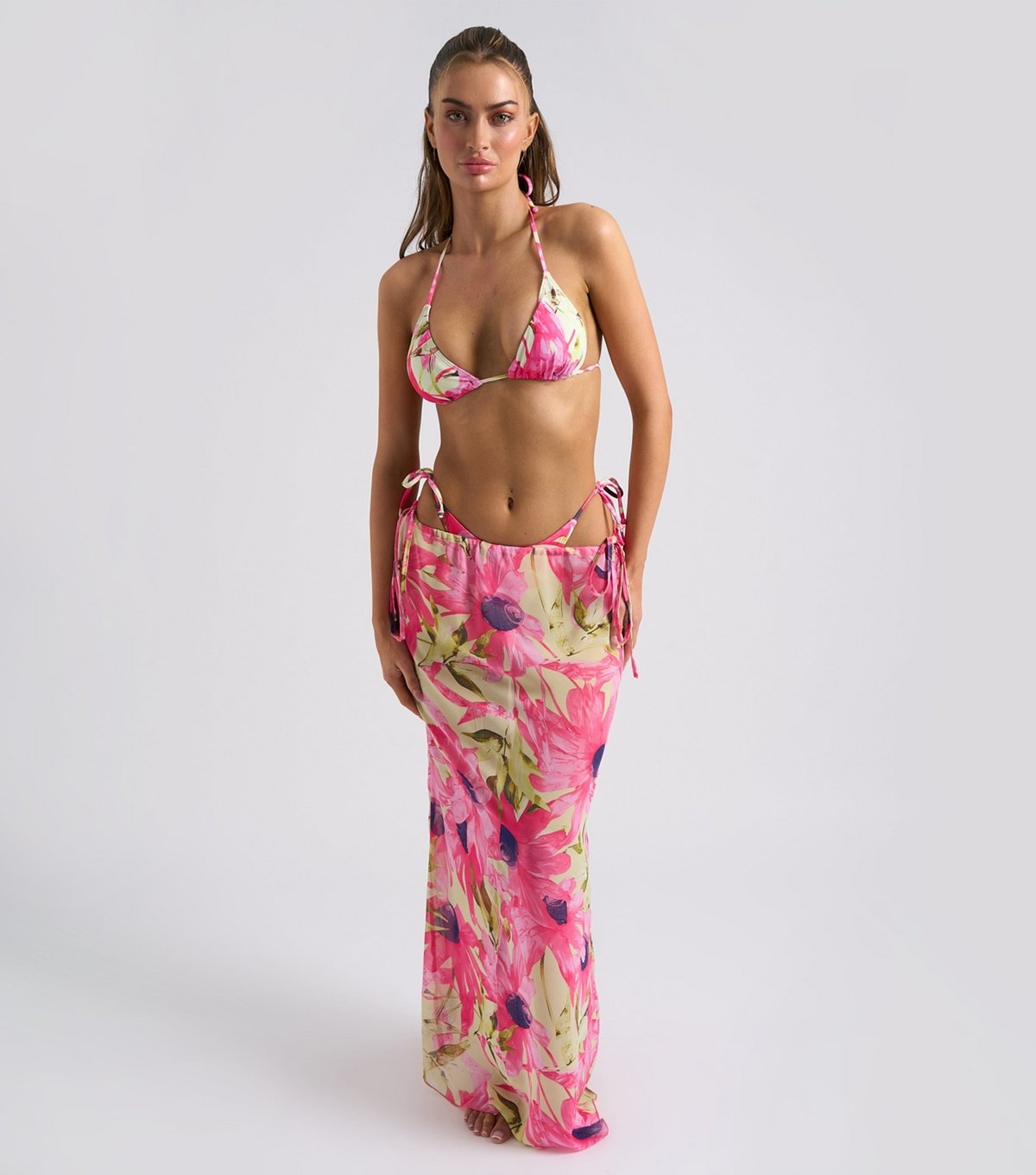 Vibrant floral print maxi skirt in pink, green, and lilac. Features a drawstring waist for adjustable fit. Ideal for beachwear or casual summer outings.