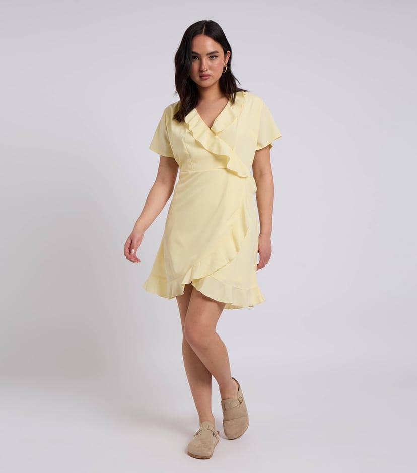 Charming light yellow mini tea dress by Urban Bliss. Featuring a V-neckline, short sleeves, and a wrap-style front with frilly trim. The concealed rear zip adds a touch of ease. Ideal for casual outings or summer events.