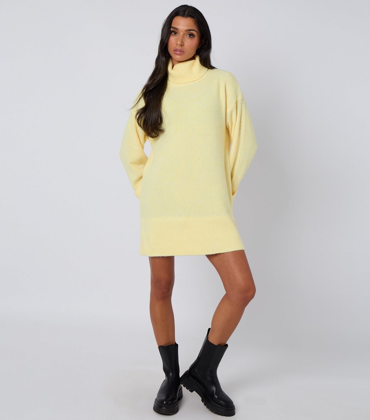 This cosy oversized jumper dress from Urban Bliss is perfect for chilly days. The light yellow knit features a snuggly roll neck and dropped shoulders for a relaxed vibe.