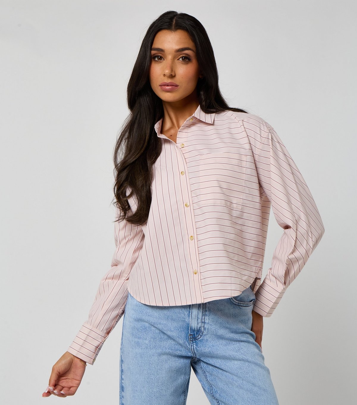 Stylish pink stripe print cropped shirt from Urban Bliss. Made from poplin fabric, it features a tailored fit and long sleeves. Ideal for smart-casual outfits.