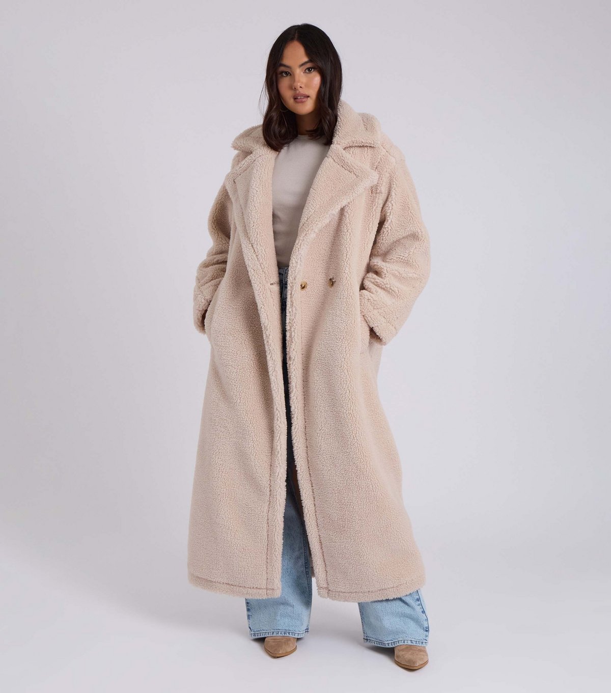 Luxurious stone borg oversized coat with a notched lapel collar and side slit pockets. Perfect for a cozy, relaxed look.