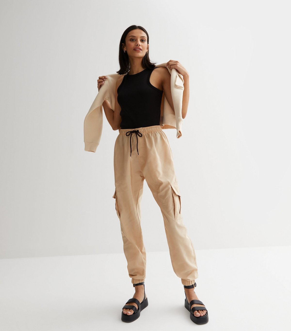 Trendy stone parachute cargo trousers by Urban Bliss. Featuring an elasticated tie high waist, utility pockets, and a relaxed fit. Ideal for a casual, off-duty look.