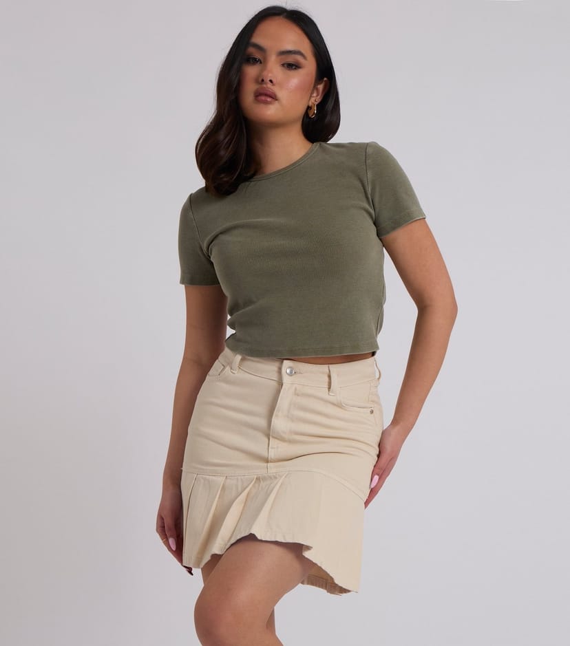 Stylish stone twill mini skirt from Urban Bliss featuring a high-waist design, pleated tiered hem, and three front pockets. Ideal for a casual yet chic look.