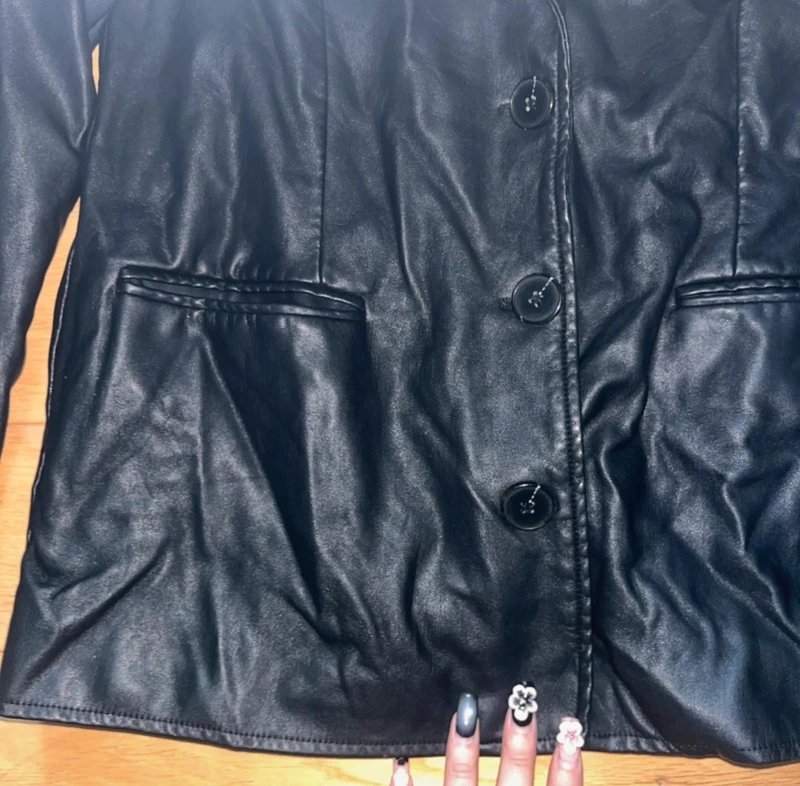 The Urban Outfitters Black Leather Jacket with Button Detail is available in sizes S.