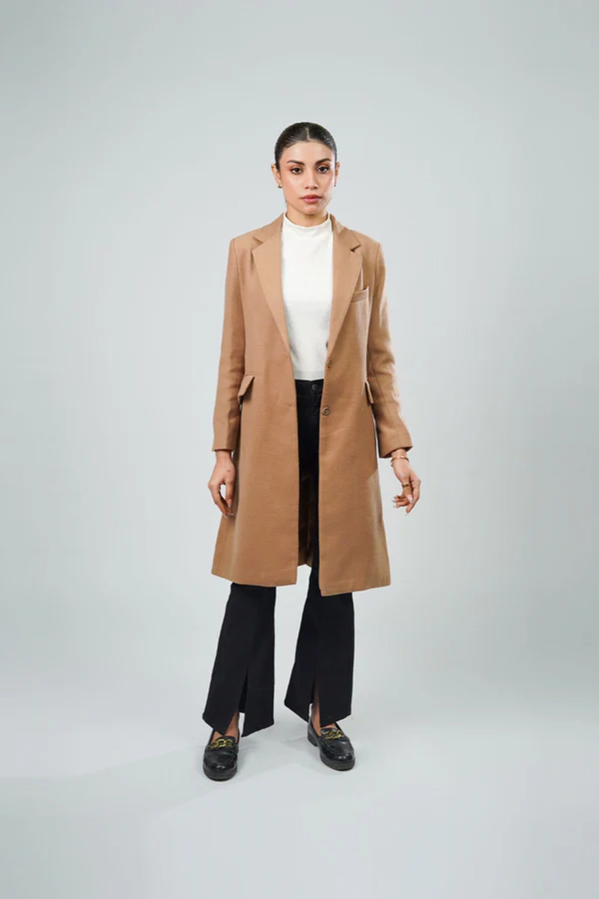 Elegant neutral beige longline coat designed for timeless style and everyday comfort. The clean, minimal silhouette creates a polished look while providing warm coverage for colder days.