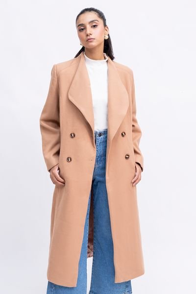 Sophisticated light brown wool blend overcoat with a double-breasted buttoned closure. The soft hand-feel and structured drape make it perfect for any occasion, from casual to formal.