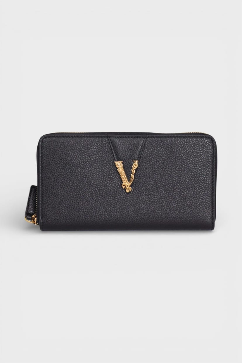 The Versace Women's Virtus Black Leather Long Wallet is available in sizes one size.