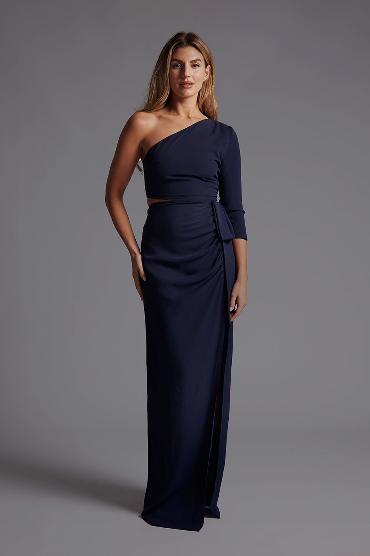 Sophisticated navy maxi dress with a ruched skirt and tasteful front cutout. The asymmetric long-sleeve design adds a unique statement. Perfect for evening events or date nights.