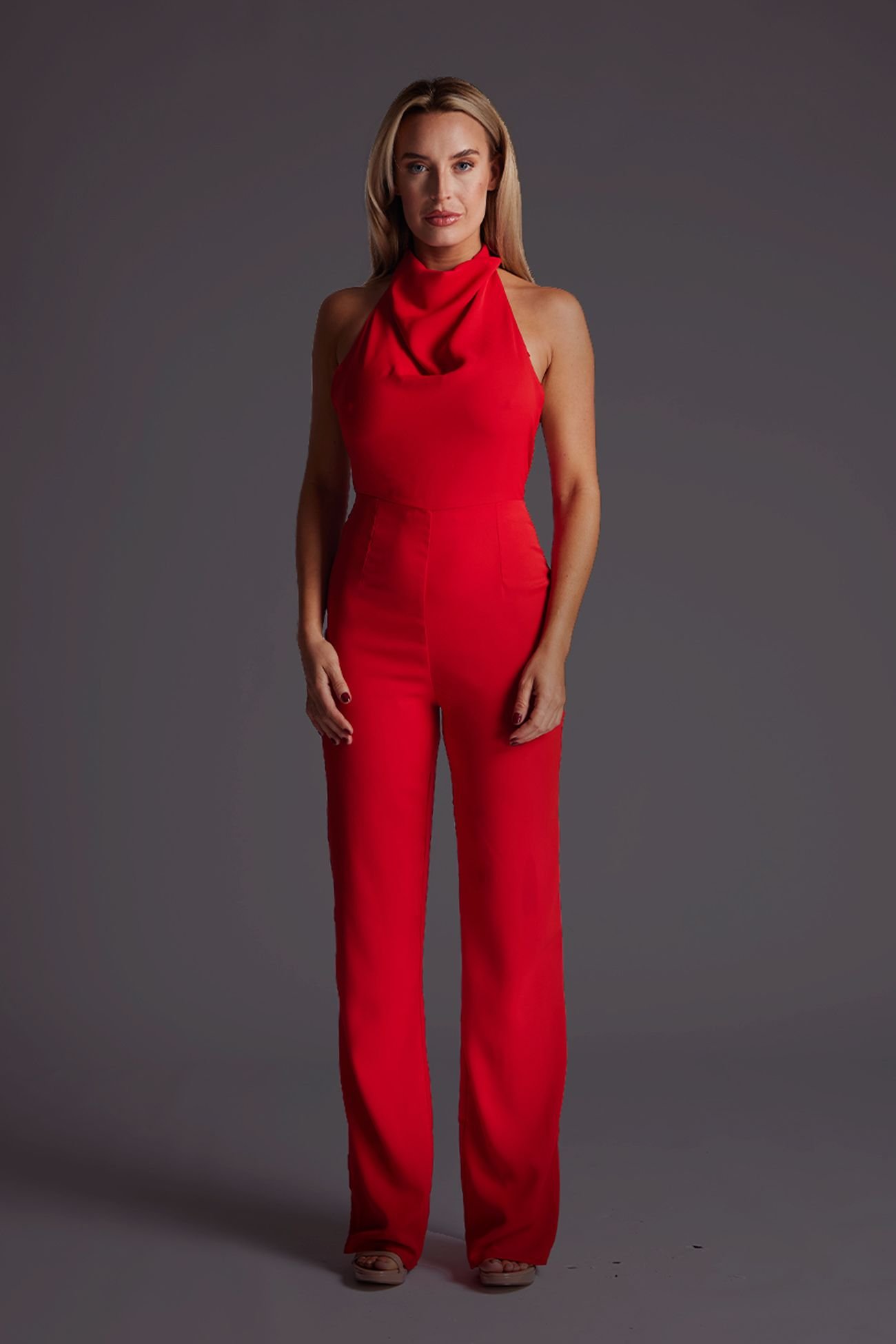 The Vesper Red Cowl Neck Wide Leg Jumpsuit is ideal for formal, evening, party.