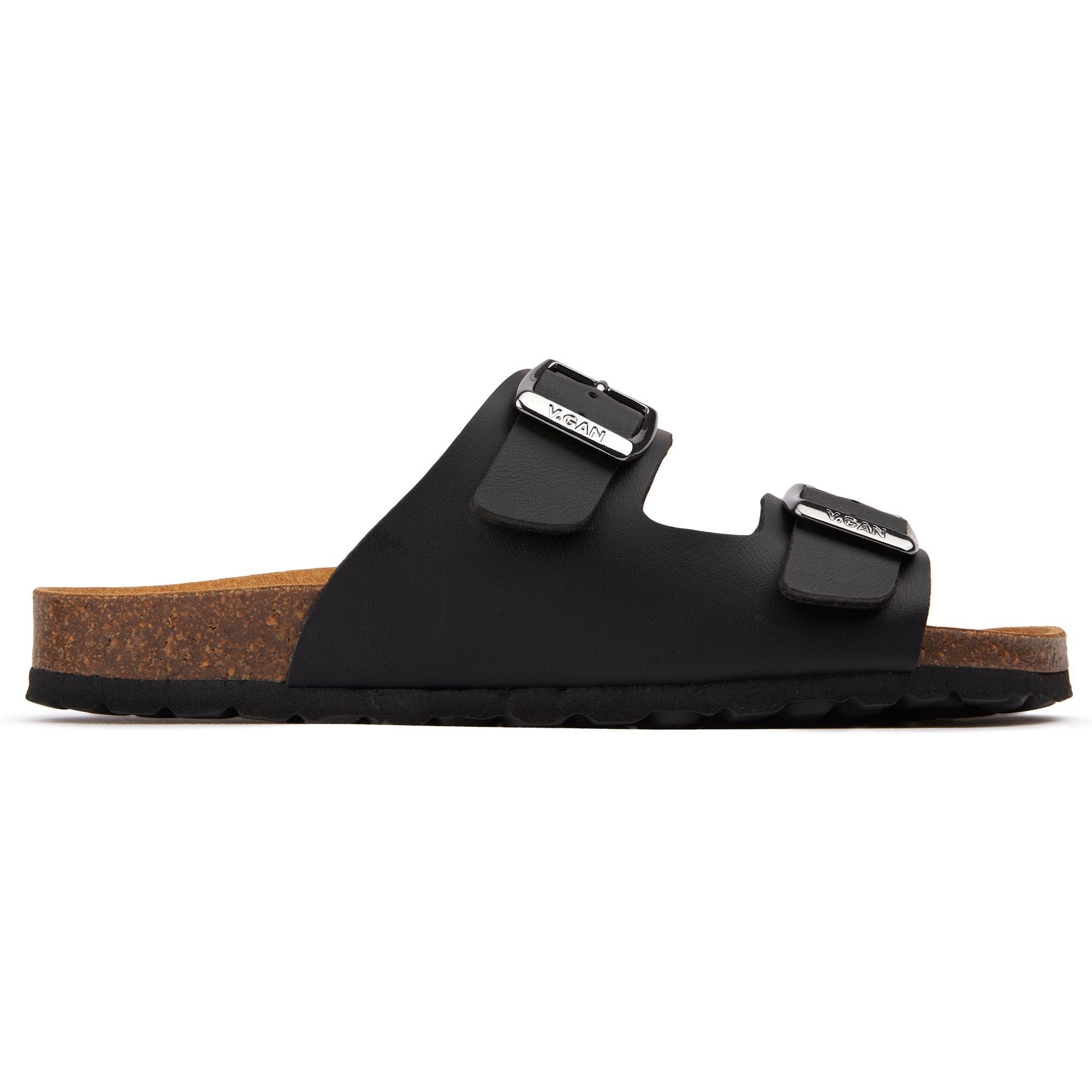 Stylish black vegan sandals featuring a slip-resistant outsole and a cork-inspired moulded footbed for all-day comfort. The two adjustable buckle straps ensure a perfect fit.