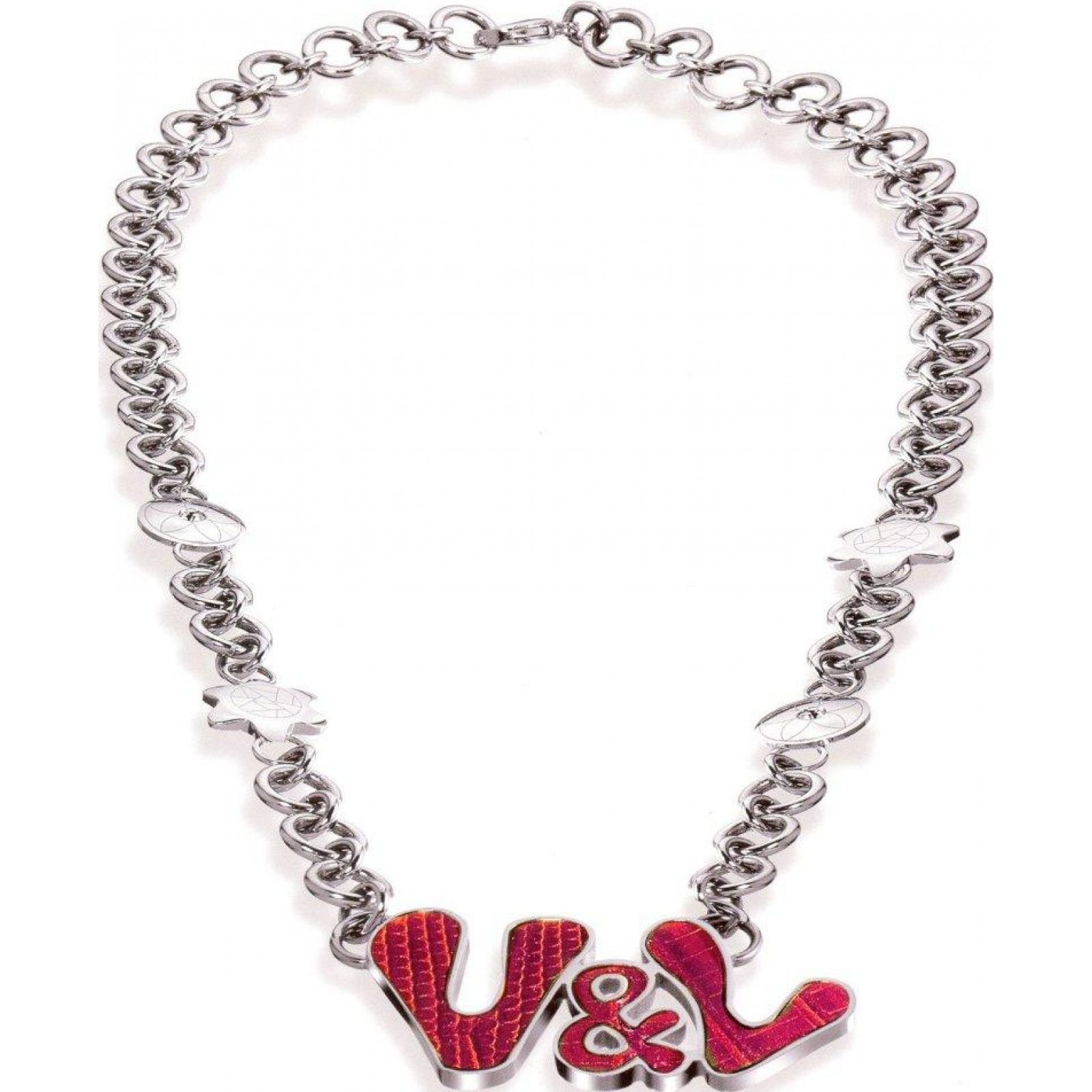 Stylish silver chain necklace from Victorio & Lucchino featuring a bold red logo centrepiece. Perfect for adding a touch of luxury to any outfit.