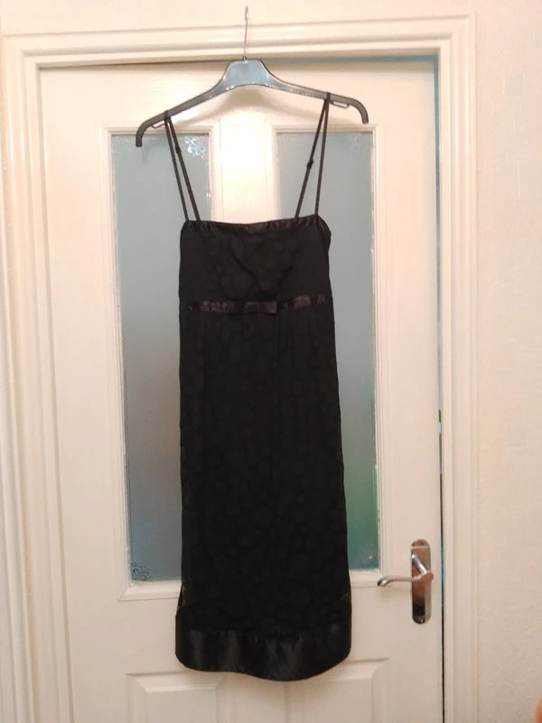 Black Knee-Length Chiffon Dress — the perfect choice for evening events and special occasions. Designed in jet black, this knee-length dress features adjustable spaghetti straps and a satin self-tie belt. Crafted from lightweight chiffon with dotted decals in the weave, it offers a fully lined and excellent quality fit. Ideal for a touch of elegance.