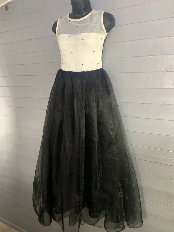 Beautiful black and white occasion dress with a soft, elegant silhouette — perfect for prom, parties, weddings, or special events. The fitted white bodice features a delicate sheer overlay with subtle embellishment detailing, giving it a light and feminine feel. This flows into a full black skirt with a tulle overlay.