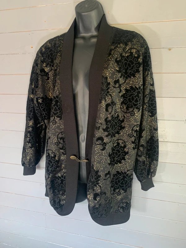 Vintage lightweight jacket in classic black with gold lurex thread running throughout. Beautiful ornate baroque-style pattern with a subtle shimmer. Unique hook and chain fastening to the front — a really lovely detail. Soft, lightweight feel — perfect for layering over evening or occa.