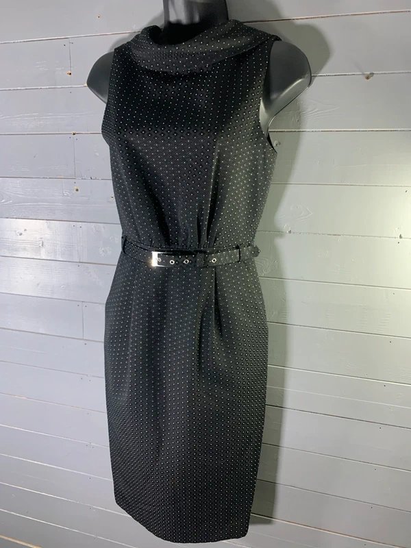 A smart and elegant black dress by Warehouse featuring a subtle textured dot pattern woven into the fabric, giving it a lovely refined finish. Designed in a flattering tailored pencil style with a matching waist belt to accentuate the waist. This timeless piece is perfect for any formal occasion.