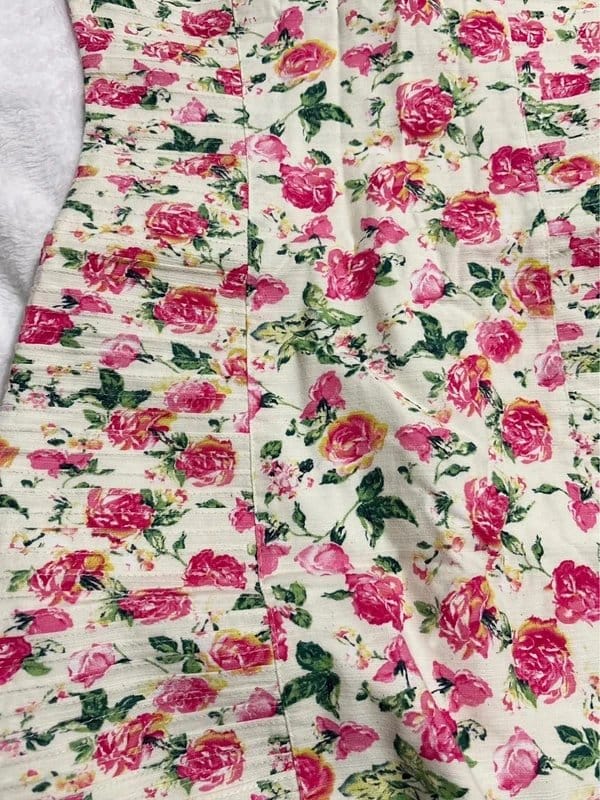 Charming pink floral corset dress with a sweetheart neckline and ruched side panels. The boned construction creates an hourglass silhouette. Perfect for a whimsical, vintage-inspired look.