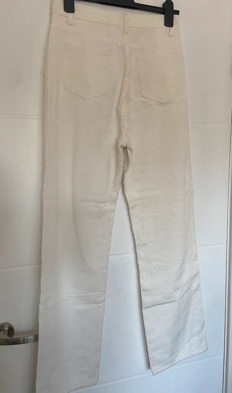 See all outfit ideasThese white textured jeans feature a vintage look with a creamy hue. The textured fabric adds a unique touch, making them perfect for casual outings.