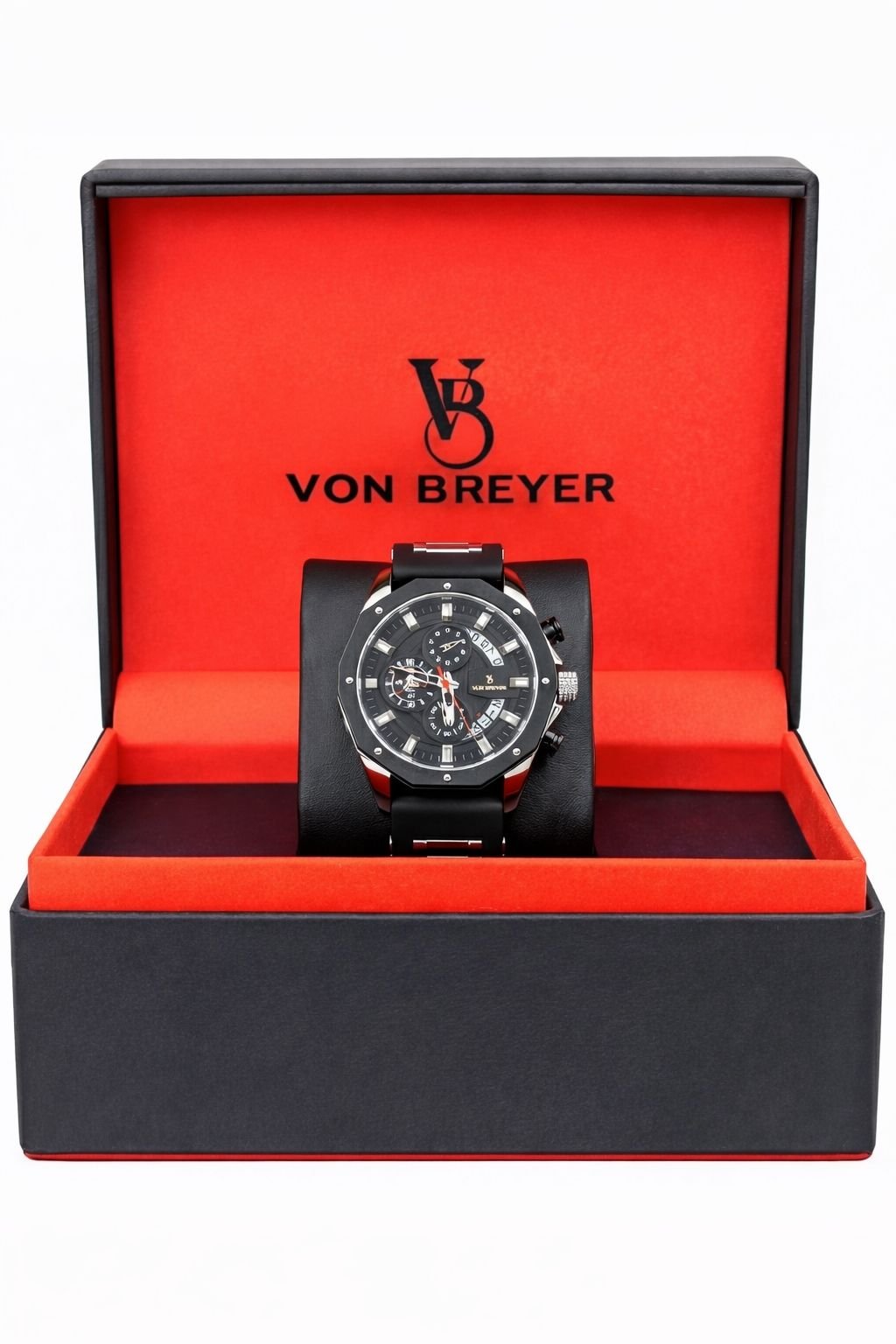 Elegant black chronograph watch from VON BREYER, featuring a steel and rubber strap. Ideal for a premium gift for men.