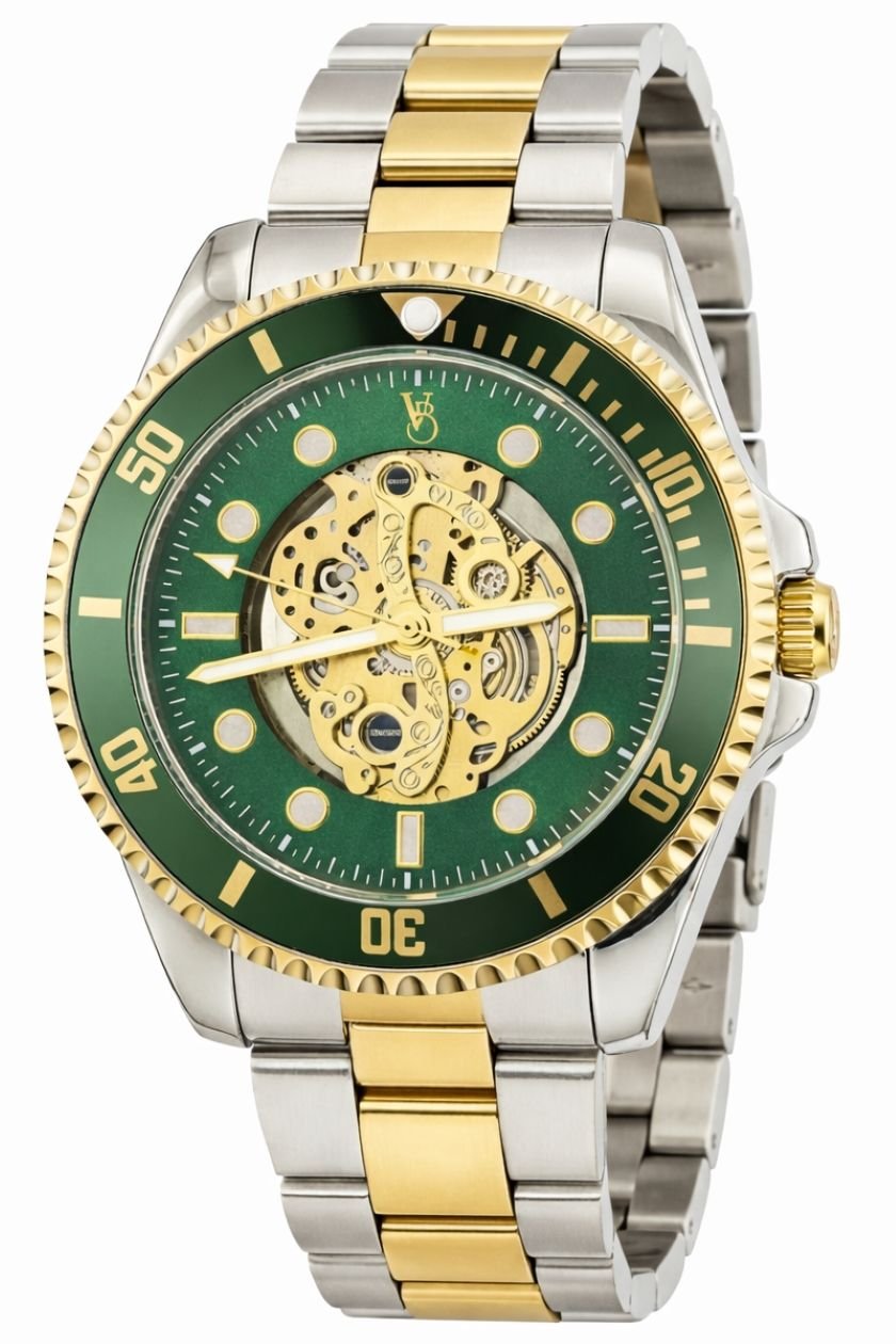 Sleek VON BREYER men's watch with a skeleton dial showcasing intricate mechanical craftsmanship. The green dial and gold-tone accents add a distinctive touch. Ideal for those who appreciate detailed design.