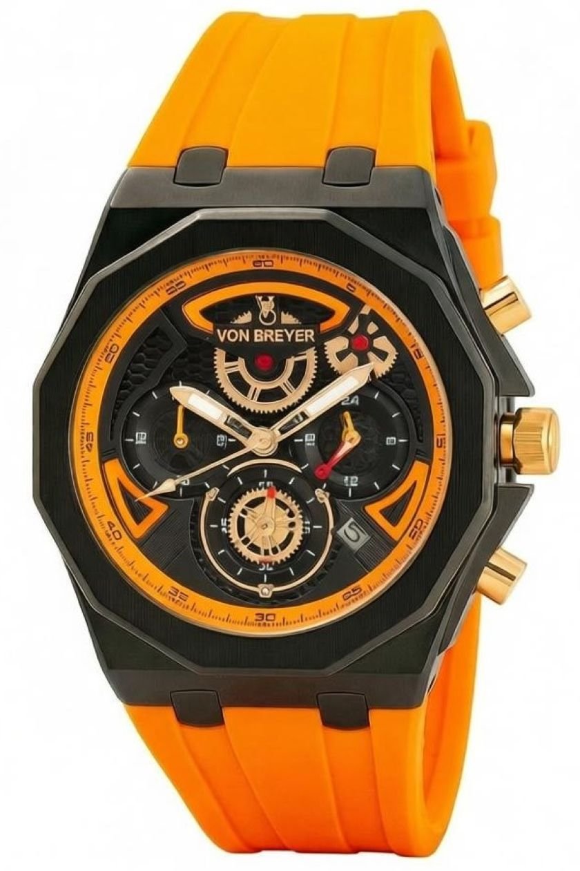 Upgrade your style with this VON BREYER men's chronograph watch, featuring an orange silicone strap and a black gold analogue dial. Designed for men who want a bold modern watch.