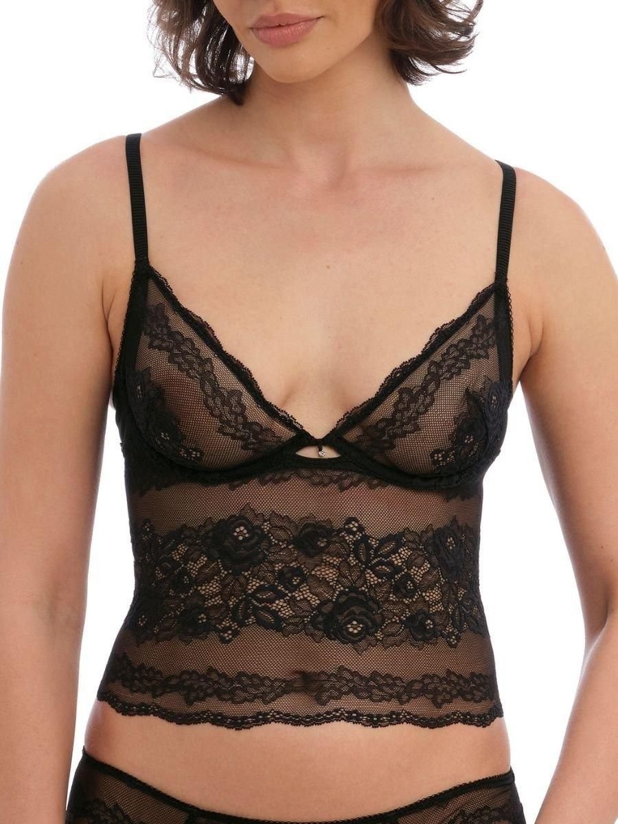 Luxurious black lace longline bralette from Wacoal. Features underwiring for support and a matching brief set. Ideal for a romantic and elegant look.